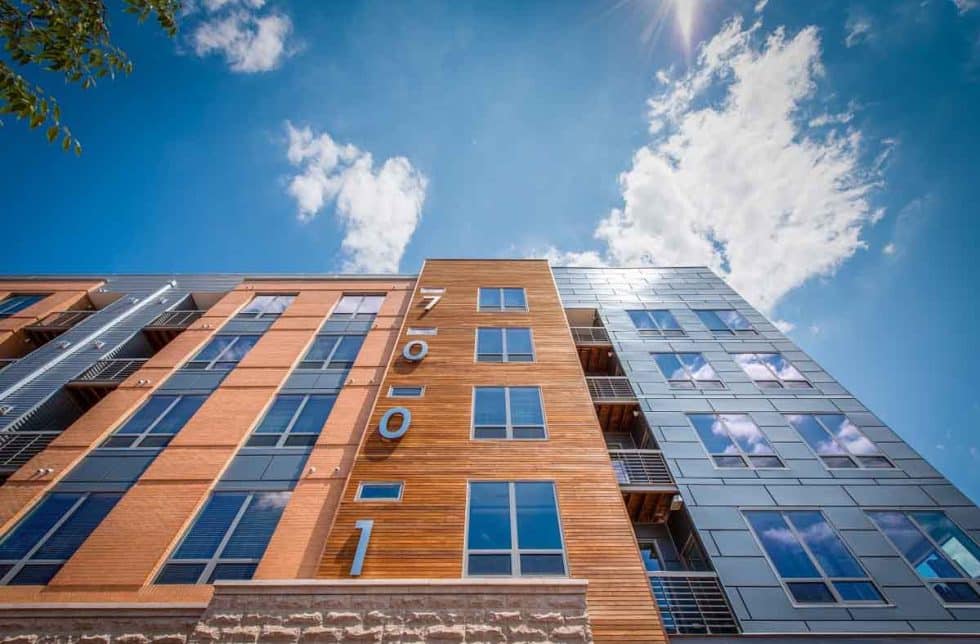 The residential portion of the building is Type III wood-framed with wood floor and roof trusses on wood stud bearing walls and a masonry stair and elevator towers supported on a concrete podium transfer slab. Structural accommodations were engineered to facilitate a ground floor car dealership. The residential entry lobby glass façade is set back under the corner of the 4-story building above created by large, cantilevered transfer girders. The deep drilled foundation system is comprised of continuous flight auger caissions designed to bear below deep layers of fill soil. The caisson foundation layout was closely coordinated to work around existing, abandoned piles from the demolished post office building. Steel bracket piles were installed to brace the existing foundation wall of a neighboring building to the north, and an existing retaining to the south was underpinned to accommodate the deeper garage excavation.