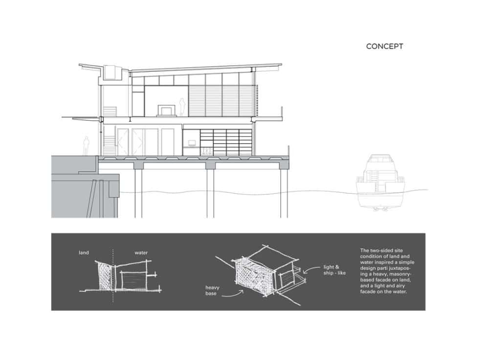 On the water-facing side, the building uses pre-patinated copper and large areas of glass with horizontal sun screens. The structure is steel-framed with a steel beam and metal deck roof and composite concrete upper floor on steel framing.
